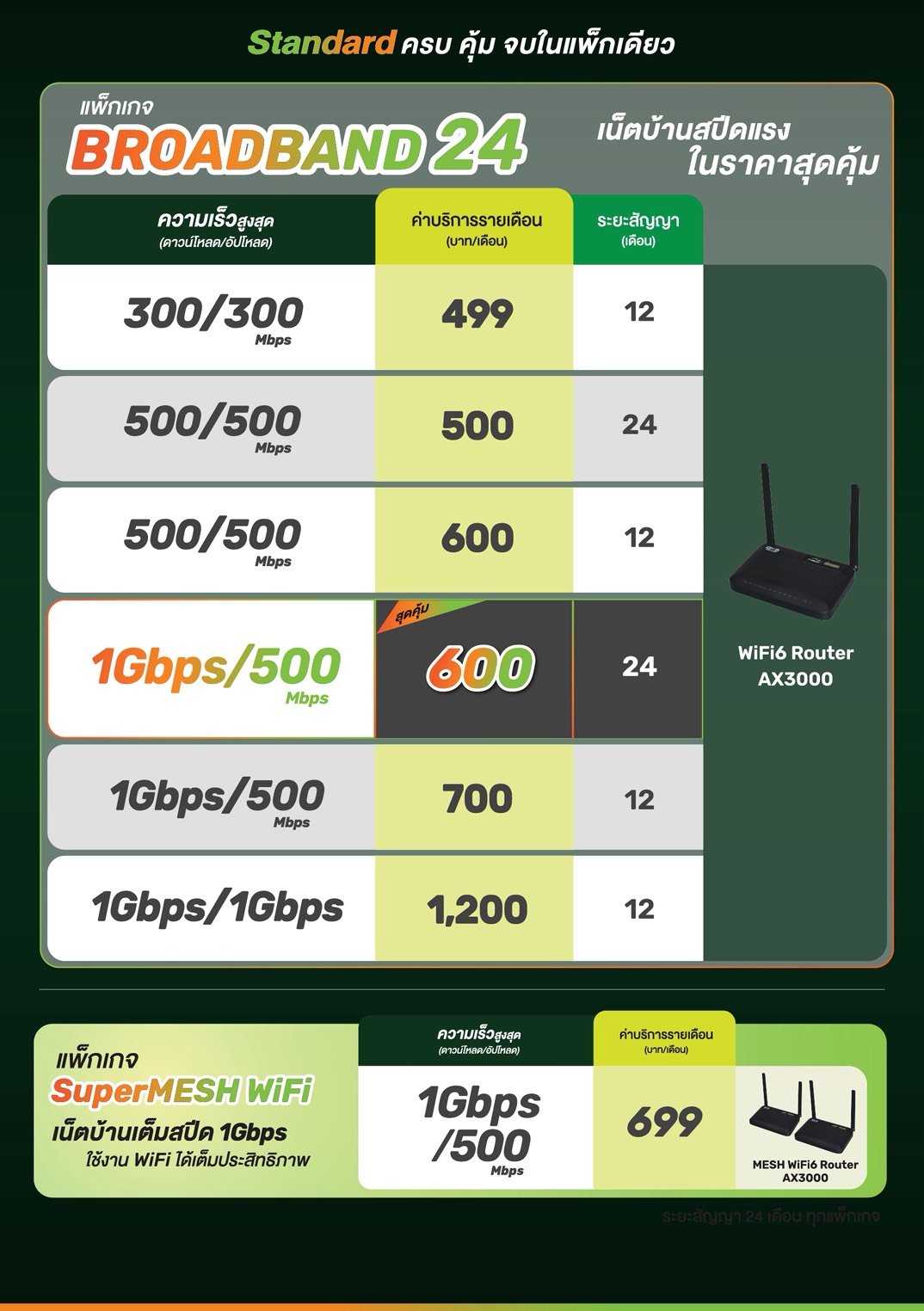 ⭐ BroadBand24 ความเร็วสูงสุด 500/500 Mbps ราคา 500 บาท/เดือน ได้รับ Router 1 ตัว (สัญญา 2 ปี)