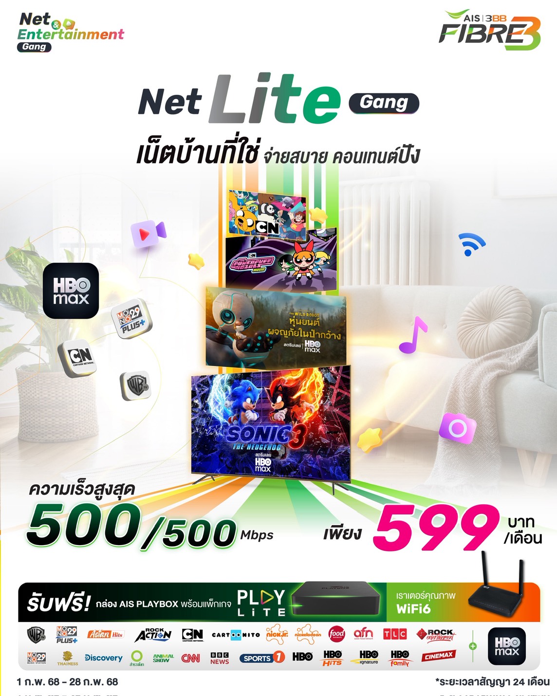 ⭐ แพคเกจ Net Lite Gang 500/500Mbps. รายเดือน 599บาท/เดือน ได้รับ WiFi Router 1 ตัว + พร้อมกล่อง Playbox 1 กล่อง + แถมคอนเท้นต์ Play Lite (สัญญา 2ปี)
